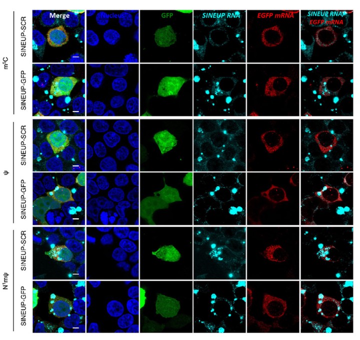 Chemically modified mRNAs are extensively studied with a view toward their clinical application. In particular, long noncoding RNAs (lncRNAs) containing SINE elements, which enhance the translation of their target mRNAs (i.e., SINEUPs), have potential as RNA therapies for various diseases, such as haploinsufficiencies. To establish a SINEUP‐based system for efficient protein expression, we directly transfected chemically modified in vitro transcribed (mIVT) SINEUP RNAs to examine their effects on target mRNA translation. mIVT SINEUP RNAs enhanced translation of EGFP mRNA and endogenous target Sox9 mRNA in both cultured cells and a cell‐free translation system. Our findings reveal the functional role of RNA modifications in SINEUPs and suggest several broad clinical applications of such an RNA regulatory system.